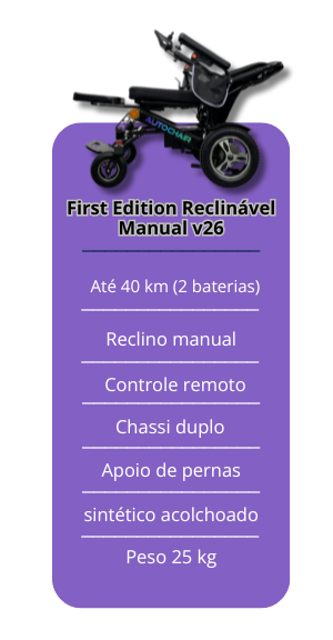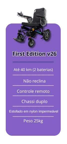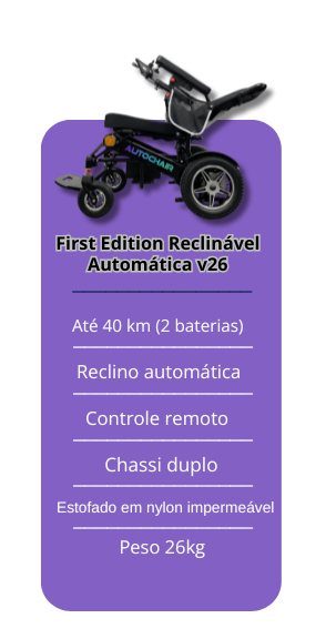 Com chassi duplo para instalação de duas baterias de íon de lítio, a AutoChair First Edition Reclinável Automática v26 alcança até 40 km de autonomia, a maior do mercado. Essa configuração garante liberdade para trajetos longos sem preocupações com recargas frequentes e coloca o modelo em posição de destaque entre as cadeiras motorizadas. Além disso, está disponível em duas versões exclusivas de cor – Prata e Black Edition – que combinam design moderno com estilo sofisticado.